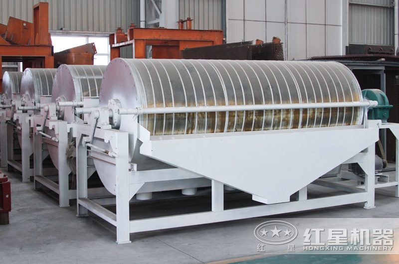 礦漿經給礦箱流入槽體后,在給礦噴水管的水流作用下,礦粒呈松散狀態進入槽體的給礦區。在磁場的作用,磁性礦粒發生磁聚而形成“磁團”或“磁鏈”,“磁團”或“磁鏈”在礦漿中受磁力作用,向磁極運動,而被吸附在圓筒上。 由于磁極的極性沿圓筒旋轉方向是交替排列的,并且在工作時固定不動,“磁團”或“磁鏈”在隨圓筒旋轉時,由于磁極交替而產生磁攪拌現象,被夾雜在“磁團”或“磁鏈”中的脈石等非磁性礦物在翻動中脫落下來,終被吸在圓筒表面的“磁團”或“磁鏈”即是精礦。精礦隨圓筒轉到磁系邊緣磁力的弱處,在卸礦水管噴出的沖洗水流作用下被卸到精礦槽中,如果是全磁磁輥,卸礦是用刷輥進行的。非磁性或弱磁性礦物被留在礦漿中隨礦漿排出槽外,即是尾礦。